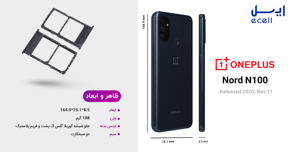 گوشی OnePlus Nord N100 قرار نیست با ظاهر و کیفیت طراحی خود کسی را تحت تاثیر قرار بدهد. طراحی این محصول مشابه گوشی وان پلاس نورد و وان پلاس 8T است با این تفاوت که برای کمشدن هزینهها، شرکت وان پلاس در بدنه گوشی نورد ان 100 از پلاستیک استفاده کرده است. یکی دیگر از تفاوتهای گوشی Nord N100 با دو محصول مذکور بزرگترشدن حاشیهها و پانچ هول یا همان حفره دوربین سلفی است.